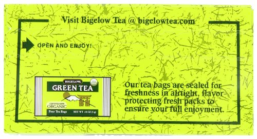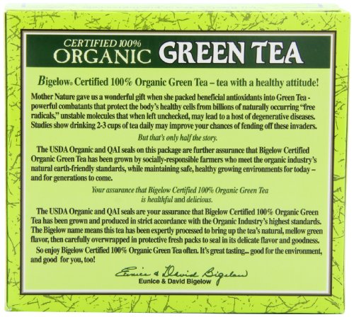 Our tea bags are sealed for freshness in airtight, flavor defending fresh packs to ensure your complete enjoyment. USDA organic. Certified 100% Organic. Bigelow Certified 100% Organic Green Tea - tea with a healthful attitude! Mother Nature gave us a superb gift when she packed useful antioxidants into Green Tea - effective combatants that defend the body\'s wholesome cells from billions of naturally occurring totally free radicals, unstable molecules that when left unchecked, may lead to a host of degenerative illnesses. Studies show that drinking 2-3 cups of tea might enhance your probabilities of fending off these invaders. But that\'s only half the story. The Certified 100% Organic tea contained in this package has the added benefits from getting been grown by socially-responsible farmers who are committed to using only natural fertilizers that are free of charge of synthetic pesticides and additives, and to keeping secure, healthier expanding environments for today and for generations to come. Your assurance that Bigelow Certified one hundred% Organic Green Tea is healthful and scrumptious. The USDA Organic and QAI seals are your assurance that Bigelow Certified 100% Organic Green Tea has been grown and created in strict accordance with the Organic Industry\'s highest standards. The Bigelow name means this tea has been expertly processed to bring up the tea\'s organic, mellow green flavor, then cautiously overwrapped in protective fresh packs to seal in its delicate flavor and goodness. So appreciate Bigelow Certified one hundred% Organic Green Tea typically. It really is wonderful tasting, good for the atmosphere, and good for you, also! Certified Organic by QAI, Inc. Blended and packaged in the U.S.A.