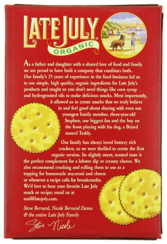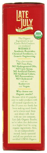 Late July Organic Classic Rich Crackers includes no trans fats, hydrogenated oils, cholesterol, preservatives, artificial flavors or colors and are vegetarian, dairy free. The components for our new snacks are a throwback to the days before modern agribusiness. As opposed to conventional, pesticide-sprayed crops grown for higher yields rather than flavor, organic crops are fragile and costly, but the payoff is immense: superior flavor, peace of thoughts, and a cleaner, safer environment. Our recipes are inspired by a bygone era as well. By way of our snacks, we hope to perpetuate the tradition of the little, local 19th century snack maker that used to be located all across the country. Our Organic Classic Rich is a fancy cracker with a slightly sweet, buttery toasted flavor produced with organic, soft, red winter wheat. Only the finest mills give the soft, red winter wheat. This wheat's reduce gluten content combined with non-hydrogenated, trans fat totally free organic palm oil (not to be confused with palm kernel oil) provides our cracker its flaky texture. The hint of sweetness is supplied by organic can juice. Our Organic Classic Wealthy brings out the fruity, nutty flavor of firm cheeses like Swiss Gruyere and French Comte, and gives a superb foil for creamy, ripened cheeses such as Brie and Camembert. These traits make it best for serving at wine and cheese parties, and to take along on picnics.