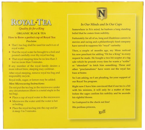 Organic black tea. one hundred individually wrapped tea bags. Net weight of 7.5 ounce. Organic black tea. Quality match for a king. one hundred individually wrapped tea bags.