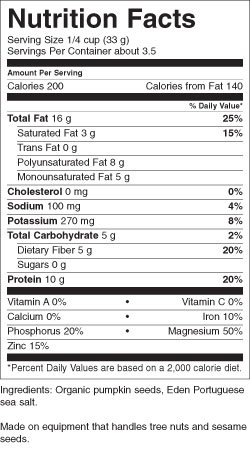 Organic Pumpkin Seeds Dry Roasted Salted by Eden Organic four oz Seed Pumpkin Seeds Dry Roasted Salted Organic The scrumptious flavor of dry roasted organic pumpkin seeds lightly coated with a bit of our fine Atlantic sea salt. Low in sodium cholesterol free of charge and an excellent source of magnesium and dietary fiber. Fantastic for parties camping backpacking or a nutritious snack any time. Wheat free non gluten cholesterol totally free and rich in dietary fiber protein and magnesium. Resealable package. Size 4 oz 113 g Ingredients Organic Pumpkin Seeds Sea Salt Consists of no added oil refined salt additives or preservatives.