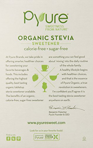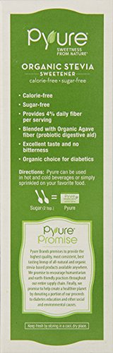 Take sweetness from nature with you wherever you go with individually packaged stevia sweetener. Pyure\'s Organic Stevia is blended with organic agave fiber to provide four% of your everyday fiber wants per serving. Calorie free and sugar free with no bitter aftertaste, Organic Stevia can be used in hot and cold beverages or sprinkled on your favorite meals.