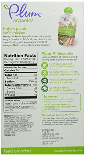 Plum Organics Baby Stage 3 Meals, Quinoa, Leeks with Chicken and Tarragon, 4 Ounce (Pack of 6) 3.6 out of 5 based on 113 ratings. 113 user reviews