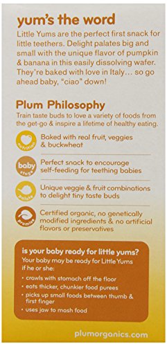 Plum Organics Small Yums Pumpkin Banana Teething Wafers, 3 Ounce - six per pack -- six packs per case. Little Yums, a line of baby teething wafers made with complete grain buckwheat and real fruit and veggies, is the excellent 1st snack for tiny teethers. The wafer simply dissolves, encourages self-feeding for teething babies, and is produced with distinctive fruit and vegetable combinations to delight tiny taste buds. Each and every wafer is baked in Italy with adore, and is certified organic making use of delicious and nutritious components like buckwheat, pumpkin, and banana. Certified by the Non-GMO Project No artificial flavors or preservatives No mess remedy Effortlessly dissolves for practical feeding Created with 100 Percent BPA-totally free packaging 95 Percentage Organic, Wheat Totally free View Nutrition Reality
