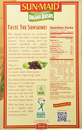 Sun-Maid Organic Sun Dried Raisins are exclusively grown by Sun-Maid\'s Certified Organic growers. These Growers meet the strictest standards for organic agriculture. Once Organic California Thompson Seedless Grapes have reached their maximum sweetness. They are harvested and naturally Sun Dried to perfection. They\'re a wonderful addition to cereals, Salads, baked goods, or eaten for a high-energy snack. Sun-Maid California Raisins have constantly been component of a wholesome diet regime. They\'re one hundred% natural, with no pils added. A quickly, easy way to get far more fruit into your diet regime is with Sun-Maid Organic Raisins. With Sun-Maid, You get it all - Top quality, Taste, Comfort and 100% true fruit goodness.