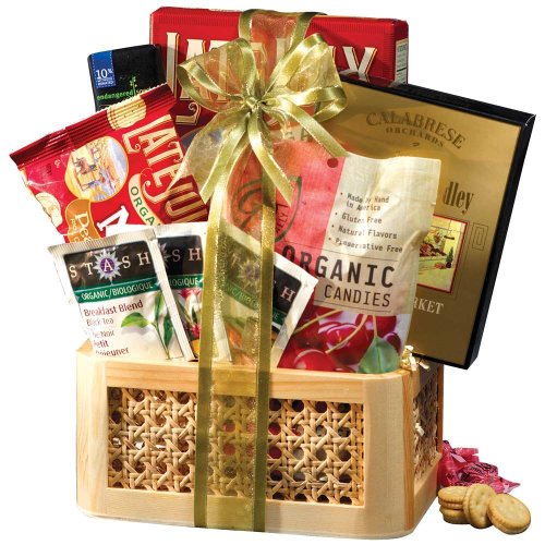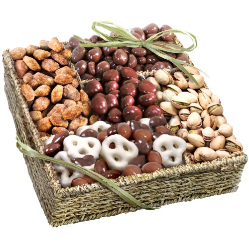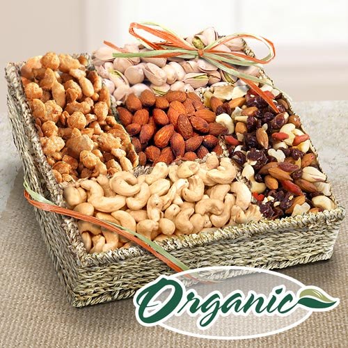 An all-organic gift basket of treats packed full of the best in organic chocolates, including organic chocolate-covered cherries, organic chocolate-covered cashews and organic chocolate and yogurt covered candy crunch mix, plus organic toffee almonds and organic roasted salted pistachios in the shell. Presented in a sturdy reusable 5-compartment seagrass basket.