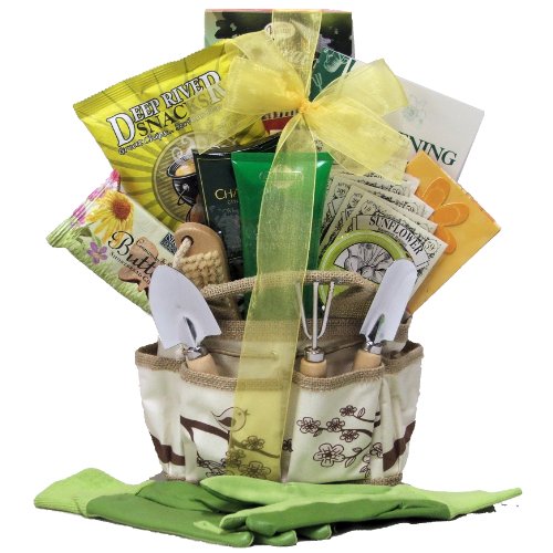 The gardening fanatic in your life is going to love to receive this adorable Garden Serenity Gardening Gift Basket. In a usable, fabric garden tote with a whimsical bird theme and 3 mini garden tools. We feature a wonderful array of not only gardening treats, but edible ones as well. Included is a helpful “Gardening Answers” book, durable canvas Gardening gloves, a wood and Sisal Nailbrush, hand and body scrub, as well as a delicious garden vegetable cheese cup, Venus seed celebration organic crackers, European chocolate truffles, cookies, snacks and more. They are sure to dig this gift for any occasion.
