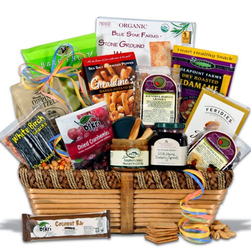 One of our most popular healthy gift baskets, this elegant design delivers a host of amazing award-winning gourmet snack foods that are low in fat and calories and taste great! Healthy and delicious can go hand-in-hand, and by sending one of our healthy baskets, you know that we’ll do all the work while you get all the credit. Inside they’ll find delicious apple chips, amazing raspberry honey mustard pretzel dip, honey wheat dipping pretzels, organic crackers, three types of healthy trail mix, dried cranberries, blueberry jam with no sugar added, roasted peanuts, potato stix , and amazing granola. Send the best of good health and good taste with this healthy gift basket.