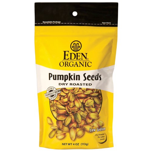 Organic Pumpkin Seeds Dry Roasted Salted by Eden Organic 4 oz Seed Pumpkin Seeds Dry Roasted Salted Organic The delicious flavor of dry roasted organic pumpkin seeds lightly coated with a bit of our fine Atlantic sea salt. Low in sodium cholesterol free and an excellent source of magnesium and dietary fiber. Great for parties camping backpacking or a nutritious snack any time. Wheat free non gluten cholesterol free and rich in dietary fiber protein and magnesium. Resealable package. Size 4 oz 113 g Ingredients Organic Pumpkin Seeds Sea Salt Contains no added oil refined salt additives or preservatives.