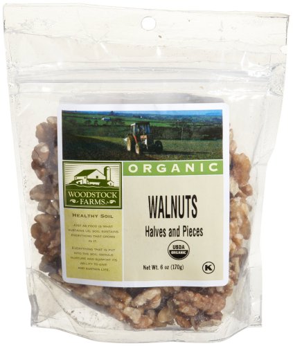 Woodstock Farms organic walnuts halves and pieces come in 6 ounce bags. Perfect as an ingredient for baking or confections, this delicious nut is an excellent source of omega-3 essential fatty acids. It contains organic raw walnuts, natural or organic ingredients. Contains tree nuts. It is a kosher certified product. Woodstock Farms was created to honor the inseparable relationship between the vitality of the soil, the energy of plants, the taste of ripeness and the viability of farming. It has grown to an extensive line of organic and natural grocery, dairy and frounceen food products that includes bulk items, food service items as well as consumer-packaged products. Woodstock Farms products combine excellent quality and affordable prices. As one of the original national organic and natural brands, it enjoys broad distribution in the natural food market place.