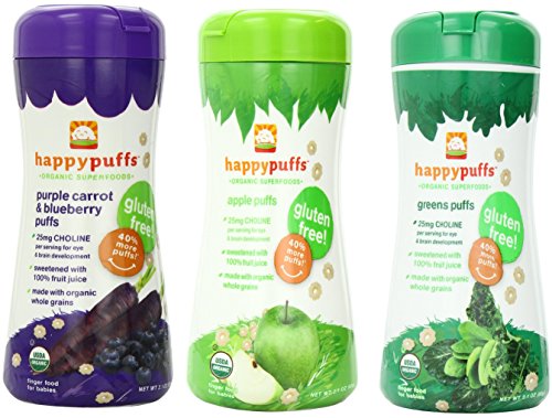 THE HAPPYBABY DIFFERENCE ? Always organic: Never any artificial flavorings. Sweetened with 100% fruit juice. Our puffs are made with organic whole grains, fruits and vegetables. ? Fortified with vitamins & minerals: Enriched with 40 IUs (10%) of your baby’s recommended daily value of Vitamin D. According to the American Academy of Pediatrics, many infants are deficient in this vital nutrient. ? Recommended by: Dr. Bob Sears, renowned pediatrician and author of The Baby Book. ? Better value: Our containers hold 40% more product than the leading brands. (Gerber and Beech-Nut are 1.5oz each) ? BPA and PVC free and recyclable packaging: The canister is made from #2 HDPE plastic and the lid is #5 PP plastic. Both are recyclable in most U.S. cities.
