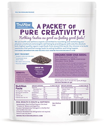 TruVibe 100% Certified Organic Raw Chia Seeds Chia is the Mayan word for strength and played major roles of importance in the Aztec, Mayan, and Inca cultures dating back to 3500 BC. It is most well known as the staple food and survival ration of the Aztec warriors. At this time chia seeds were considered to be almost magical for their ability to increase stamina and energy over long periods of time. They are a fantastic vegan source of Omega 3, 6, 9 essential fatty acids. Our chia seeds are sustainably sourced directly from small farms in Mexico and Argentina. Key Nutrition Benefits of TruVibe Organic Chia Seeds Omega 3’s: 2420mg per serving! Omega-3’s are known to support heart and brain function, promote healthy skin and hair Fiber: Contains a mix of soluble and insoluble fiber and are known as one of the best sources of soluble fiber. Antioxidants: TruVibe’s Chia contains the extremely healthy antioxidants myricetin, kaempferol, quercetin, caffeic and chlorogenic acids which may prevent cellular damage. Suggested Uses: Add to smoothies, salads, soups, desserts, yogurt, even add to sandwiches and wraps. The TruVibe Advantage: All of our products are infused with positive energetic packaging and brand messaging to further energetically enhance your overall well-being, brighten your day, and inspire you to be your true potential. 100% Money Back Satisfaction Guarantee: If you are not happy for any reason we will give you a full refund within 30 days of purchase!