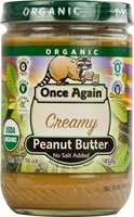 Peanut Butter Creamy No Salt Organic by Once Again Nut Butters 16 oz Liquid Peanut Butter Creamy No Salt Organic 16 oz Liquid Just peanuts Oil separation occurs naturally. To prevent stir and refrigerate or freeze. Once Again packages in glass jars to preserve the flavor profile and maximize the shelf-life of their products and glass is conducive to recycling One Ingredient Organic Peanuts USDA Organic Gluten Free Vegan Sodium Free No Sugar Supplement Facts Serving Size 2 Tablespoons Servings Per Container 15 Amount Per Serving Daily Value Calories 210 Calories From Fat 150 Total Fat 16 g 25 Saturated Fat 3 mg 15 Trans Fat 0 g Cholesterol 0 mg 0 Sodium 0 g 0 Total Carbohydrates 6 g 2 Dietary Fiber 2 g 8 Sugars 2 g Protein 9 g Vitamin A 0 Vitamin C 0 Iron 2 Daily Value Not Established Percent Daily Values are based on a 2 000 calorie diet Other Ingredients Organic Peanuts. Warnings Keep out of reach of children. As with all dietary supplements consult your healthcare professional befor