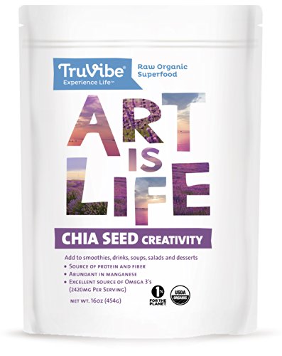 TruVibe 100% Certified Organic Raw Chia Seeds Chia is the Mayan word for strength and played major roles of importance in the Aztec, Mayan, and Inca cultures dating back to 3500 BC. It is most well known as the staple food and survival ration of the Aztec warriors. At this time chia seeds were considered to be almost magical for their ability to increase stamina and energy over long periods of time. They are a fantastic vegan source of Omega 3, 6, 9 essential fatty acids. Our chia seeds are sustainably sourced directly from small farms in Mexico and Argentina. Key Nutrition Benefits of TruVibe Organic Chia Seeds Omega 3’s: 2420mg per serving! Omega-3’s are known to support heart and brain function, promote healthy skin and hair Fiber: Contains a mix of soluble and insoluble fiber and are known as one of the best sources of soluble fiber. Antioxidants: TruVibe’s Chia contains the extremely healthy antioxidants myricetin, kaempferol, quercetin, caffeic and chlorogenic acids which may prevent cellular damage. Suggested Uses: Add to smoothies, salads, soups, desserts, yogurt, even add to sandwiches and wraps. The TruVibe Advantage: All of our products are infused with positive energetic packaging and brand messaging to further energetically enhance your overall well-being, brighten your day, and inspire you to be your true potential. 100% Money Back Satisfaction Guarantee: If you are not happy for any reason we will give you a full refund within 30 days of purchase!