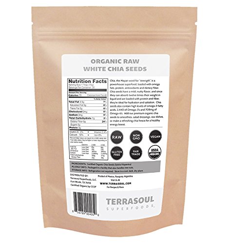 About Terrasoul Superfoods Organic White Chia Seeds: Chia, the Mayan word for \"strength\", is a powerhouse superfood, loaded with omega fats, protein, antioxidants and fiber. Chia seeds have a mild, nutty flavor, and considering that they can absorb twelve occasions their weight in liquid and are loaded with protein and fiber, they are perfect for hydration and appetite satiation. Chia seeds are considered to be almost magical for their capacity to improve stamina and power more than long periods of time. Crucial Nutrition Rewards of Terrasoul Superfoods Organic Chia Seeds: Omega Fatty Acids: Chia seeds are rich in omega 3, six, and 9 fatty acids. Chia seeds include eight occasions far more omega-three fatty acids than salmon creating them a wonderful vegan source of important fatty acids. Plant Protein and Calcium: Chia seeds are a healthy supply of protein and 1 serving includes 10% of your day-to-day recommended calcium. Antioxidants: Chia seeds also include a lot more antioxidants than flaxseeds and are straightforward to incorporate into your day-to-day diet regime. Suggested Makes use of: Mix them into smoothies, drinks, salad dressings, make chia puddings, or sprout them. Why get from Terrasoul Superfoods? - We stand behind our items and offer a 30-day income back assure, backed by an outstanding consumer service group. - We supply only the freshest and highest top quality components from sustainable farms. - We clean and laser sort all of our chia seeds to insure they meet our strict top quality requirements. - We operate a FDA-licensed and inspected certified organic facility, in contrast to other Amazon sellers that make organic claims with out being USDA certified. Usually appear for the USDA seal and certifier on a product label when acquiring organic.