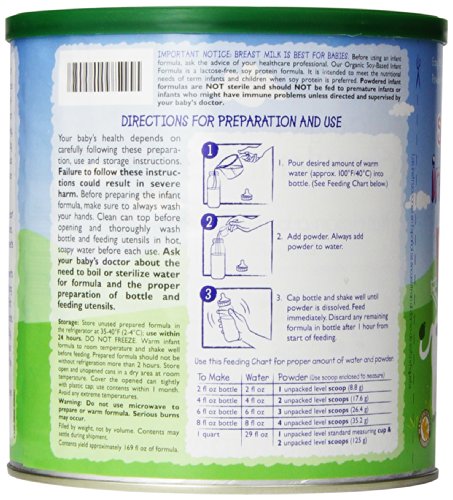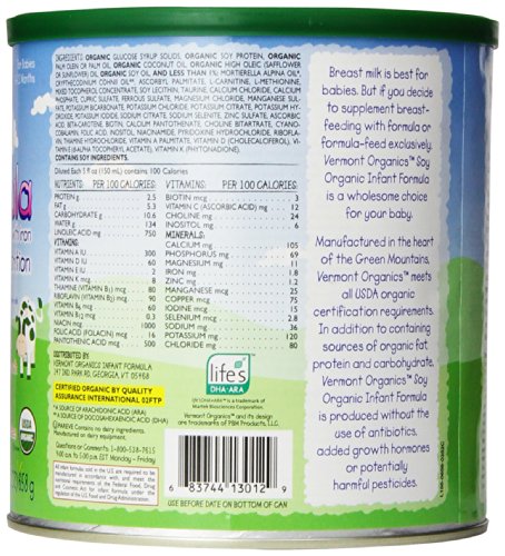 Organic Soy Formula (Milk/Lactose Cost-free Formula) If your kid is sensitive to lactose, or if you choose a vegetarian supply of protein for your baby, Vermont Organics provides an organic soy formula that is milk totally free and lactose cost-free. View larger View bigger The Formula If you and your family have gone organic and you prefer a vegetarian supply of protein for your infant, Vermont Organics delivers an organic soy formula that may possibly be proper for you. Be positive to consult with your baby’s pediatrician if you believe your child is sensitive to lactose and want to use a soy baby formula. Certified Organic Soy Formula Meets USDA Regulations Vermont Organics Soy Infant Formula is certified organic and meets all FDA and USDA regulations. Organic soy formula functions consist of: Milk-Free of charge, Lactose-Totally free, Gluten-Totally free, Kosher, No Potentially Damaging Pesticides, Produced with Non-GMO Ingredients A Recipe for Full Nutrition and Environmental Wellness. By picking Vermont Organics, you and your household assistance the well being and well-becoming of our planet. Our milk-totally free and lactose-free organic soy formula implies your baby\'s diet regime consists of a supply of organic soy protein. Nutritionally, Vermont Organics soy child formula has nutrients that are naturally present in mother\'s milk, which includes choline and the lipids DHA and ARA, which have been linked in scientific research that may possibly help infant brain and eye development. Soy Organic Infant Formula Highlights Certified Organic in accordance with USDA regulations, Certified Organic by High quality Assurance International (QAI), Developed with out making use of potentially damaging pesticides, Milk-totally free and lactose-totally free for babies with allergy to cows\' milk or lactose sensitivity, Fortified with iron and contains all the vitamins, minerals, and nutrients needed for your healthy baby\'s first year, Supplies nutrients located naturally in mother\'s milk that support create the immune technique, Provides choline and the lipids DHA and ARA, which supports infant brain and eye improvement, Manufactured in an ISO 9001:2008-certified, infant formula-manufacturing facility just north of Burlington, Vermont. View larger What\'s inside Components: Organic corn syrup solids, organic soy protein, organic palm olein or palm oil, organic coconut oil, organic high oleic (safflower or sunflower) oil, organic soy oil, and less than 1%: mortierella alpina oil*, crypthecodinium cohnii oil**, ascorbyl palmitate, l-carnitine, l-methionine, mixed tocopherol concentrate, soy lecithin, taurine, calcium chloride, calcium phosphate, cupric sulfate, ferrous sulfate, magnesium chloride, manganese sulfate, potassium bicarbonate, potassium chloride, potassium citrate, potassium hydroxide, potassium iodide, sodium citrate, sodium selenite, zinc sulfate, ascorbic acid, beta-carotene, biotin, calcium pantothenate, choline bitartrate, cyanocobalamin, folic acid, inositol, niacinamide, pyridoxine hydrochloride, riboflavin, thiamine hydrochloride, vitamin a palmitate, vitamin d (cholecalciferol), vitamin e (dl-alpha tocopheryl acetate), vitamin k (phytonadione). *A Supply Of Arachidonic Acid (ARA) **A Source Of Docosahexaenoic Acid (DHA) Product nutrient values and components are subject to adjust. Please see item label for existing info.